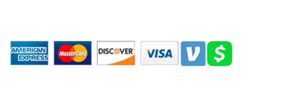 Cash, Checks, Venmo, Cash App, Credit & Debit Cards (Visa, MasterCard, American Express, Discover – 2.7% processing fee)